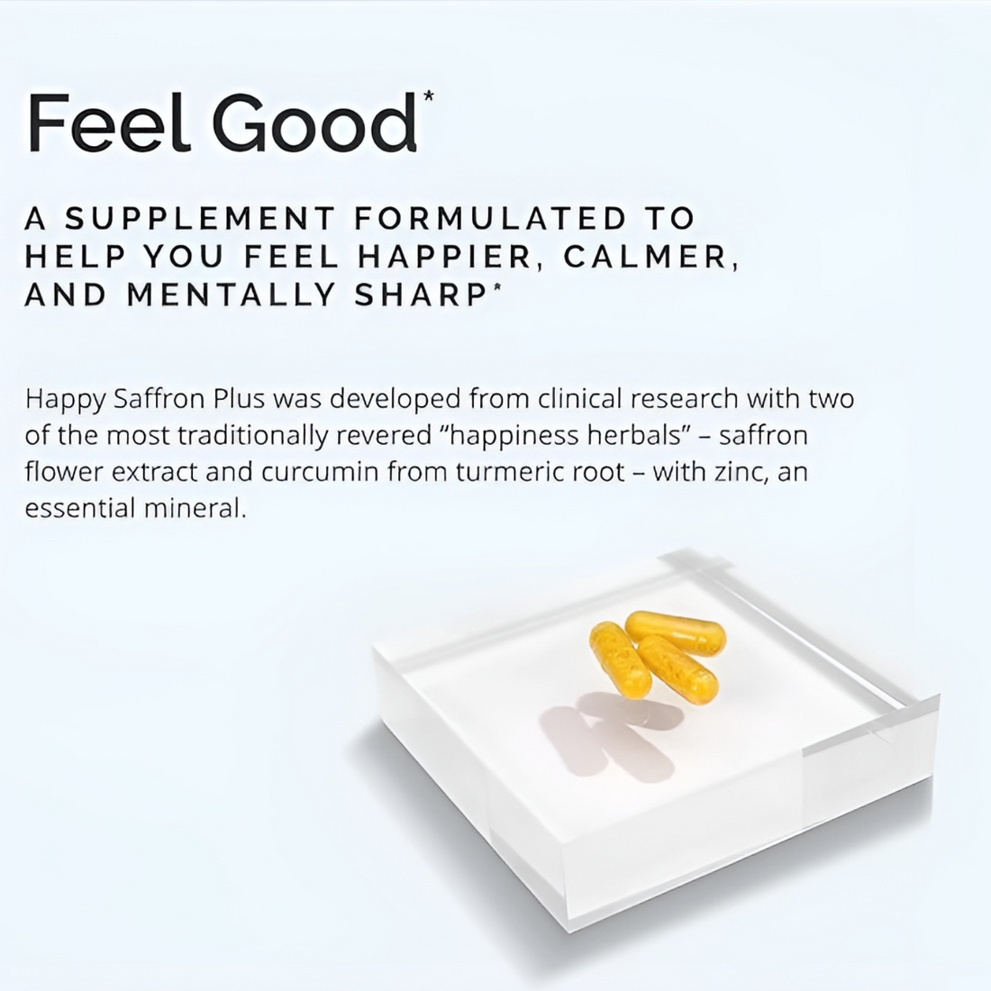 Happy Saffron Plus is a clinically supported, triple-action mood supplement featuring award-winning saffron extract, curcumin, and zinc. Formulated to naturally enhance mood, ease anxiety, improve focus, and promote emotional well-being—without unwanted side effects.